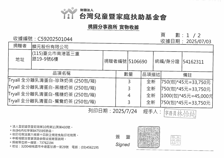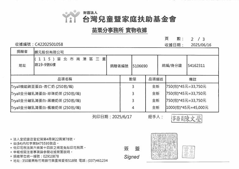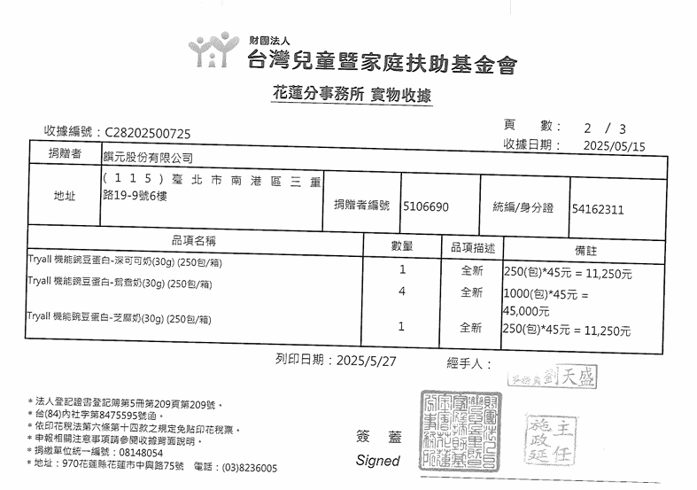 高蛋白營養補給品牌 Tryall 長期關注社會公益,今年特別針對苗栗、桃園、北台中、北高雄及花蓮五個地區的弱勢兒童,捐贈總價值高達 1,398,960 元的高蛋白營養補給品,幫助發育中的孩子及年輕運動選手獲得充足營養,健康成長。